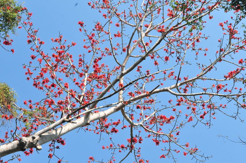 因花而樹(shù),撫摸著這粗糙的樹(shù)干、扎手的瘤刺,以前只是枯老、禿兀的印象,不免感嘆一葉障目,識(shí)有所限,貌不取樹(shù),更不識(shí)樹(shù)。反觀之,這枯老的樹(shù)木與周邊看似欣欣向榮、但略顯單調(diào)的四季長(zhǎng)青樹(shù)群相比,總能把它的禿兀樹(shù)冠高高樹(shù)立在上,不為標(biāo)新立異,不為傲視群雄,只為沐浴陽(yáng)光、吸取雨露。這種奮發(fā)圖進(jìn),努力進(jìn)取的精神;這種不求張揚(yáng)、不計(jì)得失的個(gè)性;這種不排它樹(shù)、與群共舞的隨和不正是演繹了一曲“云霧散/綠春江/花果飄香鳥(niǎo)歡暢”的《木棉花開(kāi)》之歌嗎?